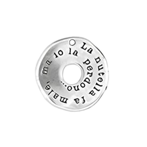 CONFEZIONE DA 10 PEZZI DELLO STESSO COLORE E SCRITTA. MONETA PENDENTE TONDA BUCATA AL CENTRO, IRREGOLARE E MISURA 25 MM, IN ZAMA. LA SCRITTA GIRA TUTTO IN TORNO A SPIRALE. “ LA NUTELLA FA MALE, MA IO LA PERDONO. “