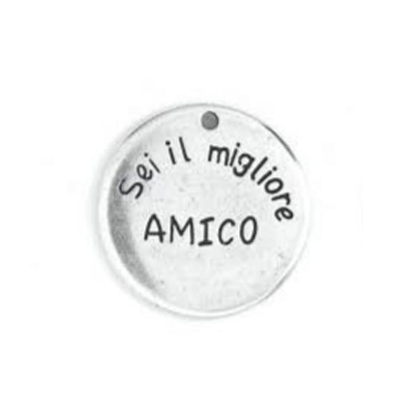 Confezione da 7 pezzi dello stesso colore e scritta. Moneta pendente, tonda, liscia e regolare che misura 25 mm, in zama. Sul retro c’è inciso il profilo sottile di un cuore, sul davanti troviamo la scritta “ sei il migliore… Amico.”